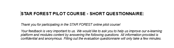 Το «ΒΙΩΣΙΜΗ ΧΡΗΣΗ ΠΟΛΥΛΕΙΤΟΥΡΓΙΚΩΝ ΔΑΣΩΝ ΚΑΙ ΤΩΝ ΜΗ ΞΥΛΩΔΩΝ ΠΡΟΪΟΝΤΩΝ ΤΟΥΣ ΩΣ ΠΗΓΗ ΑΠΑΣΧΟΛΗΣΗΣ ΚΑΙ ΠΕΡΙΒΑΛΛΟΝΤΙΚΗΣ ΒΙΩΣΙΜΟΤΗΤΑΣ» είναι ένα ενότητες μαθημάτων κατάρτισης, που ακολουθούν τις ενότητες του Προγράμματος Σπουδών STAR FOREST που βασίζονται σε ικανότητες, το οποίο δίνει έμφαση στη συλλογή μη ξυλωδών προϊόντων (όπως μανιτάρια, κάστανα και άλλα άγρια φρούτα, ρητίνη, κουκουνάρια, φαρμακευτικά φυτά και μέλι, μεταξύ άλλων). Αποτελεί το κύριο περιεχόμενο της πύλης Star Forest και θα είναι διαθέσιμο μόνιμα.